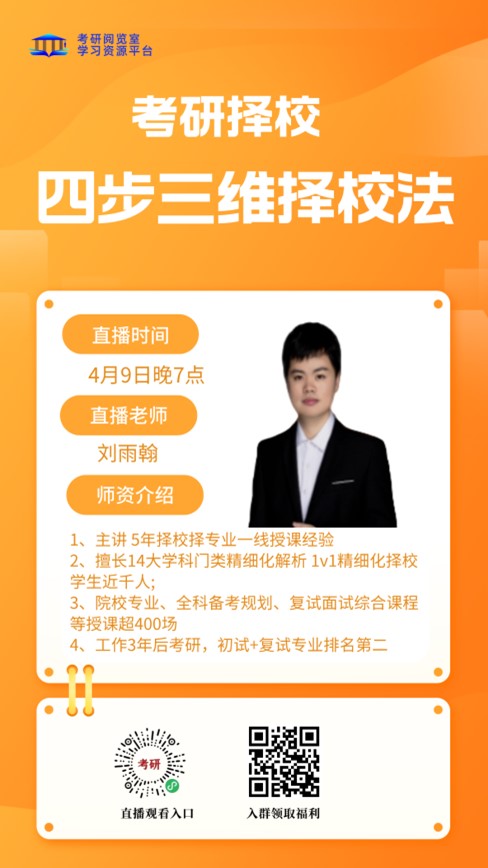 一、讲座时间:4月9日19:00~20:30二、主讲嘉宾:刘雨翰三、嘉宾介绍:启航考研金牌院校与专业规划主讲 5年择校择专业一线授课经验,擅长14大学科门类精细化解析,1v1精细化择校学生近千人院校专业、全科备考规划、复试面试综合课程等授课超400场,工作3年后考研,初试+复试业排名第二。四、主讲内容:考研专业及院校选择规划五、本次活动群和直播通道 本次讲座活动群 考研阅览室小程序(观看直播通