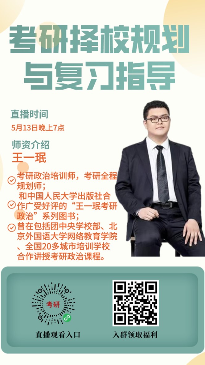 一、讲座时间:5月13日19:00~20:30二、主讲嘉宾:王一珉三、嘉宾介绍:考研政治培训师,考研全程规划师;中国人民大学出版社合作广受好评的“王一珉考研政治”系列图书;曾在包括团中央学校部、北京外国语大学网络教育学院全国20多城市培训学校合作讲授考研政治课程。四、主讲内容:考研择校规划与复习指导五、本次活动群和直播通道
