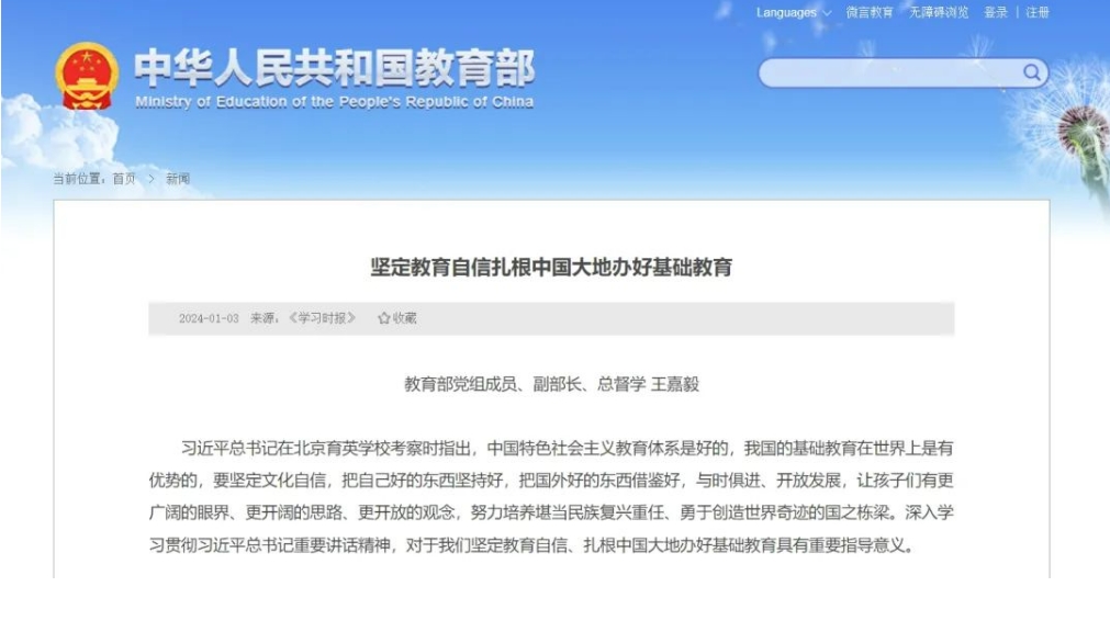 日前,《学习时报》刊发了教育部党组成员、副部长、总督学王嘉毅的文章《坚定教育自信 扎根中国大地办好基础教育》。文章指出,要充分认识我国基础教育在世界上的优势,其中包括应用信息技术,赋能基础教育高质量发展——我国始终把信息技术摆在教育现代化的战略地位,注重发挥信息技术对基础教育的引领、支撑和推动作用,将信息化与基础教育改革发展一同谋划、一同部署、一同推进,信息化基本建设实现全面覆盖,大规模应用模式取